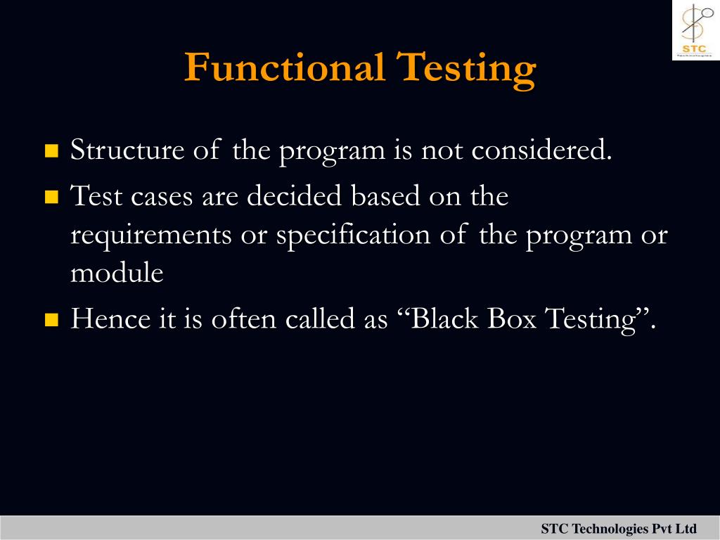 Functional Testing • Structure of the program is not considered. • Test cases are decided based on the requirements or specification of the program or module • Hence it is often called as “Black Box Testing”.