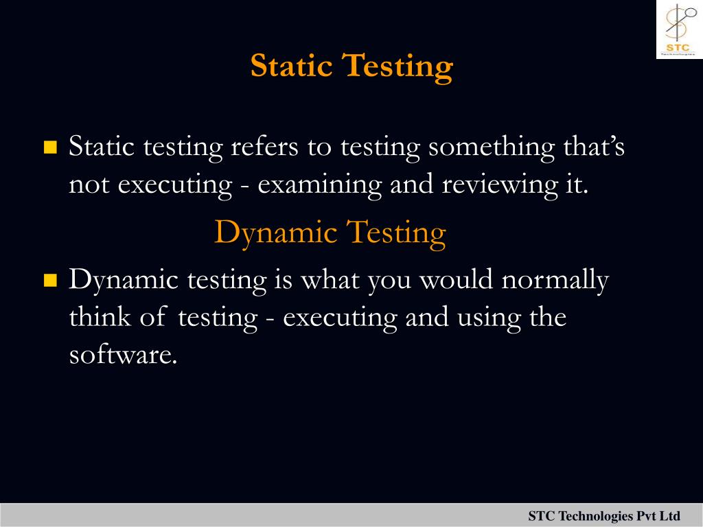 Static Testing • Static testing refers to testing something that’s not executing - examining and reviewing it. Dynamic Testing • Dynamic testing is what you would normally think of testing - executing and using the software.