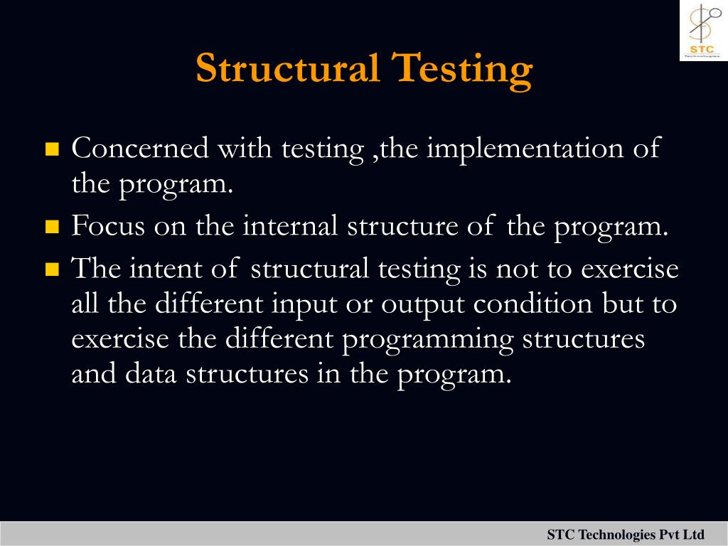 Structural Testing • Concerned with testing ,the implementation of the program. • Focus on the internal structure of the program. • The intent of structural testing is not to exercise all the different input or output condition but to exercise the different programming structures and data structures in the program.