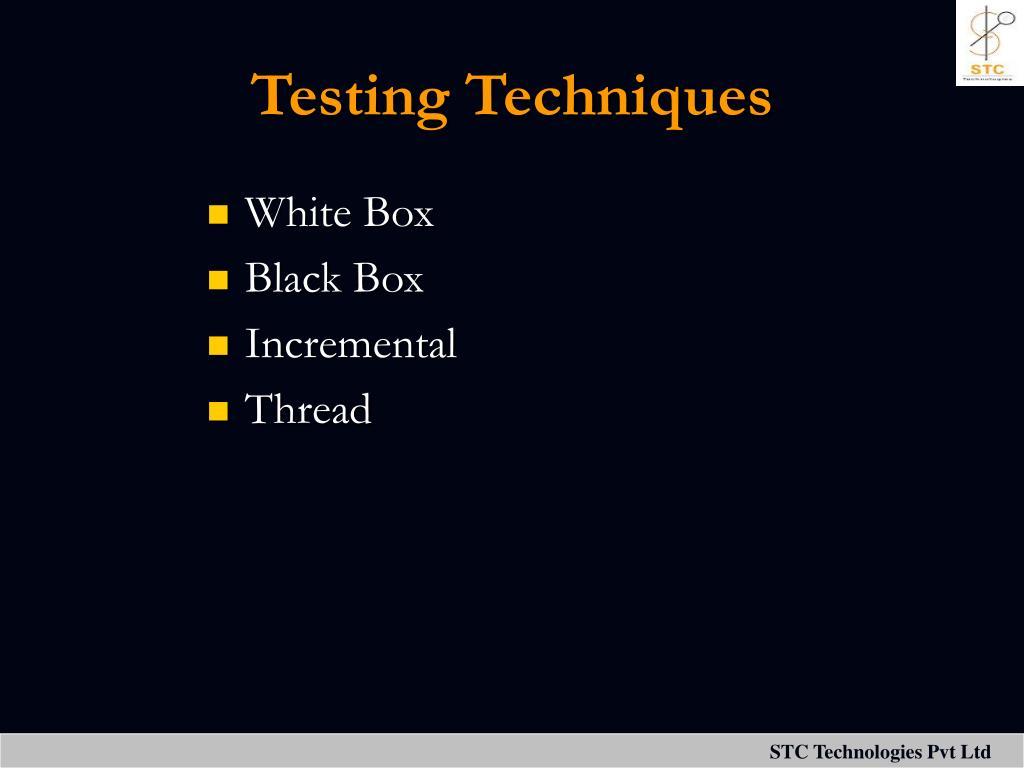 Testing Techniques • White Box • Black Box • Incremental • Thread