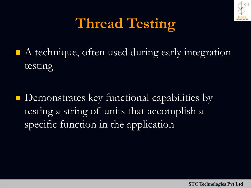 Thread Testing • A technique, often used during early integration testing • Demonstrates key functional capabilities by testing a string of units that accomplish a specific function in the application