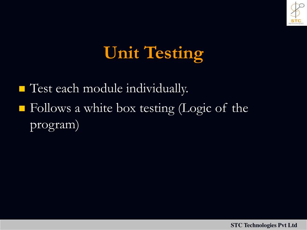 Unit Testing • Test each module individually. • Follows a white box testing (Logic of the program)