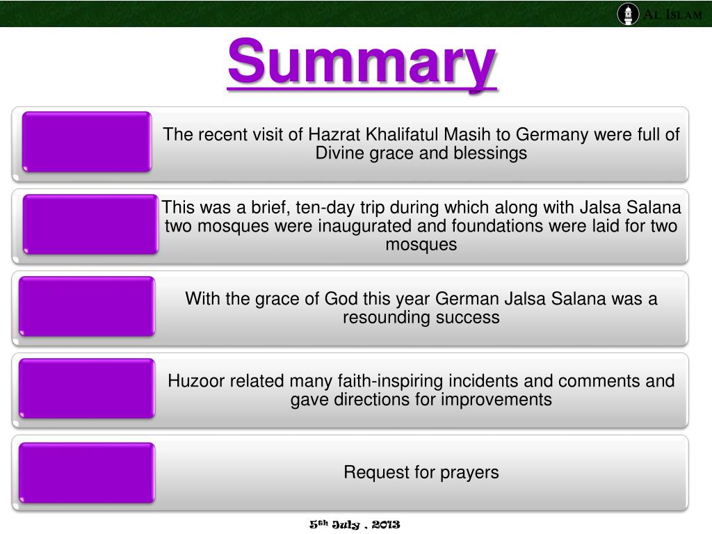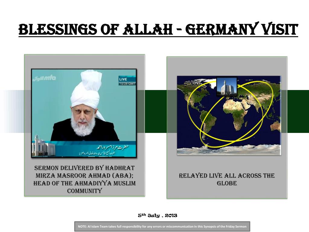 Blessings of Allah - Germany visit. 5 th July , 2013. Summary. 5 th July , 2013. Tour of Germany; Blessings of God Jalsa Salana Germany Impressions and Comments Red Book Directions Prayers.