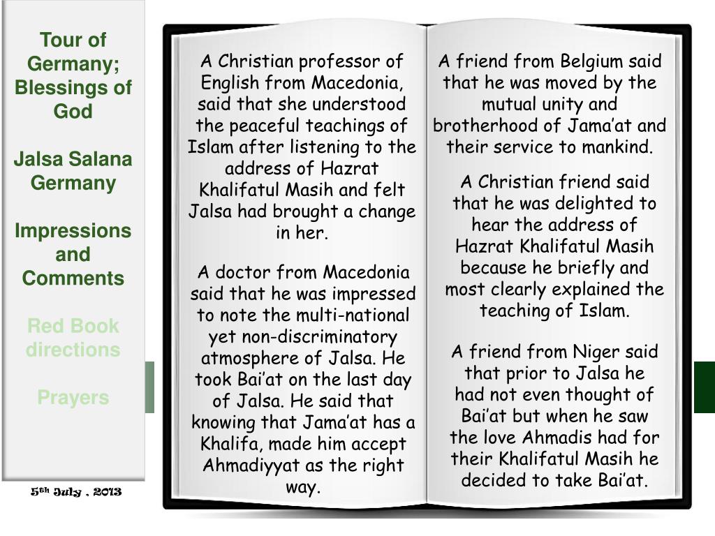 Tour of Germany; Blessings of God Jalsa Salana Germany Impressions and Comments Red Book directions Prayers A friend from Belgium said that he was moved by the mutual unity and brotherhood of Jama’at and their service to mankind. A Christian professor of English from Macedonia, said that she understood the peaceful teachings of Islam after listening to the address of Hazrat Khalifatul Masih and felt Jalsa had brought a change in her. A Christian friend said that he was delighted to hear the address of Hazrat Khalifatul Masih because he briefly and most clearly explained the teaching of Islam. A doctor from Macedonia said that he was impressed to note the multi-national yet non-discriminatory atmosphere of Jalsa. He took Bai’at on the last day of Jalsa. He said that knowing that Jama’at has a Khalifa, made him accept Ahmadiyyat as the right way. A friend from Niger said that prior to Jalsa he had not even thought of Bai’at but when he saw the love Ahmadis had for their Khalifatul Masih he decided to take Bai’at. 5th July , 2013