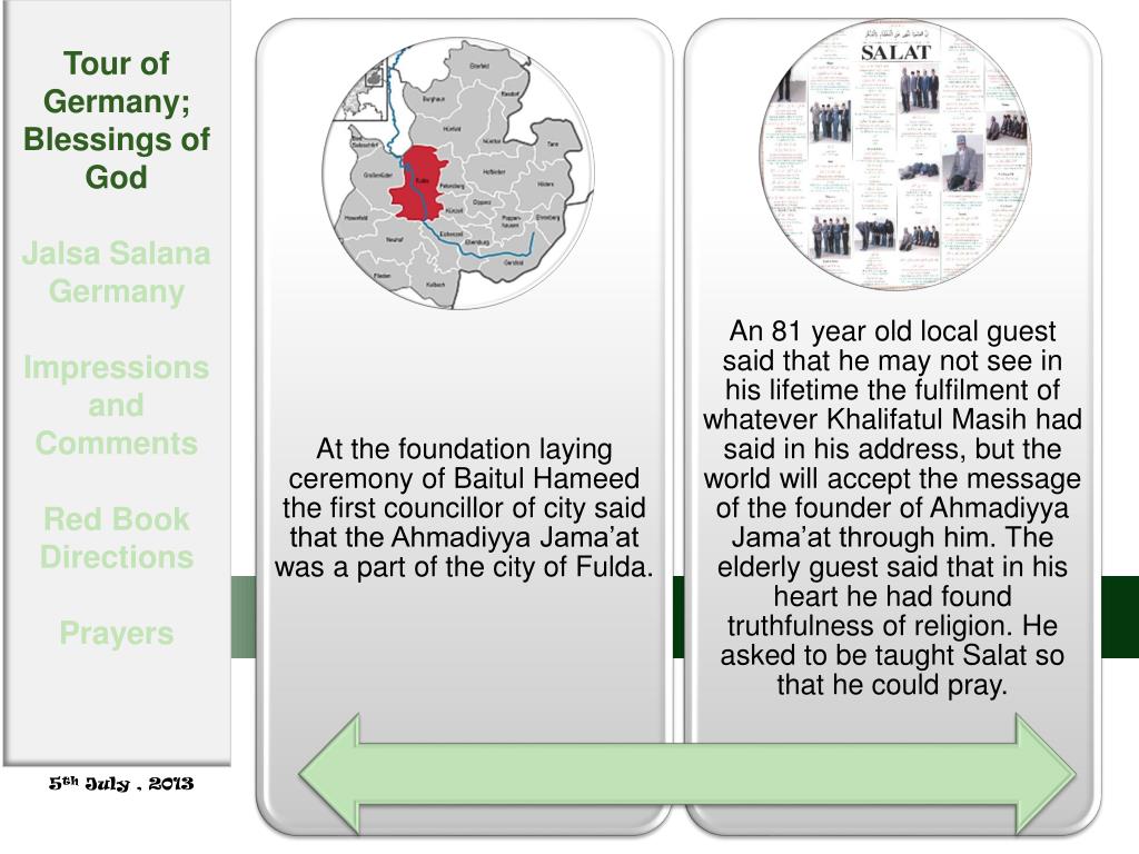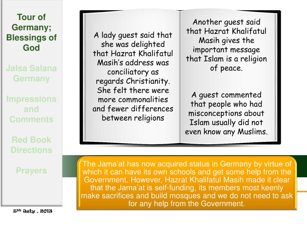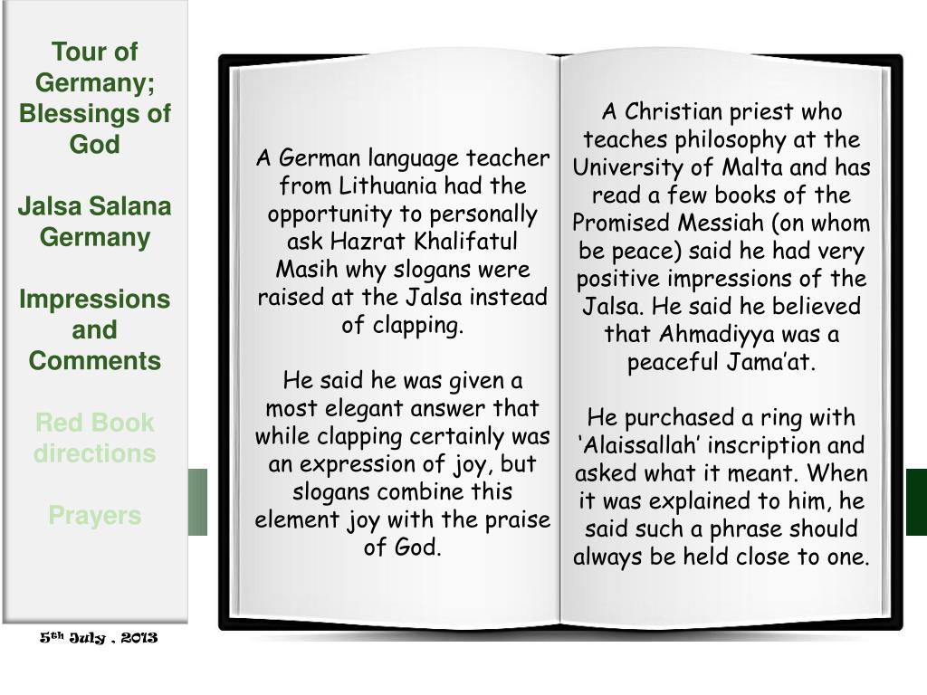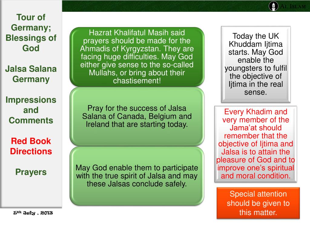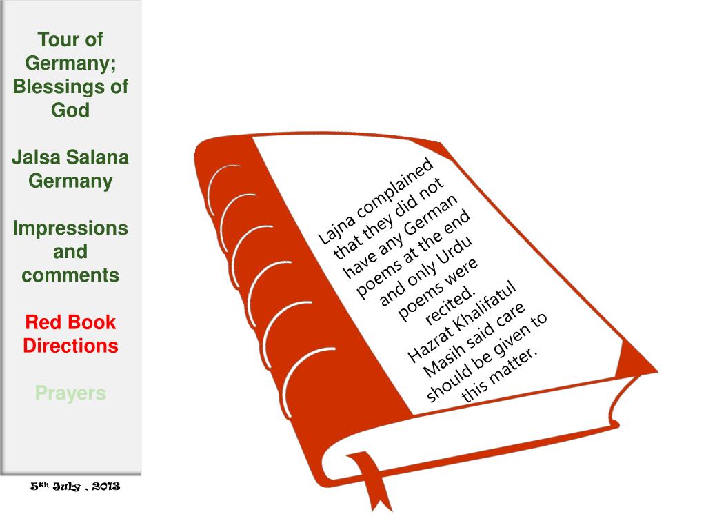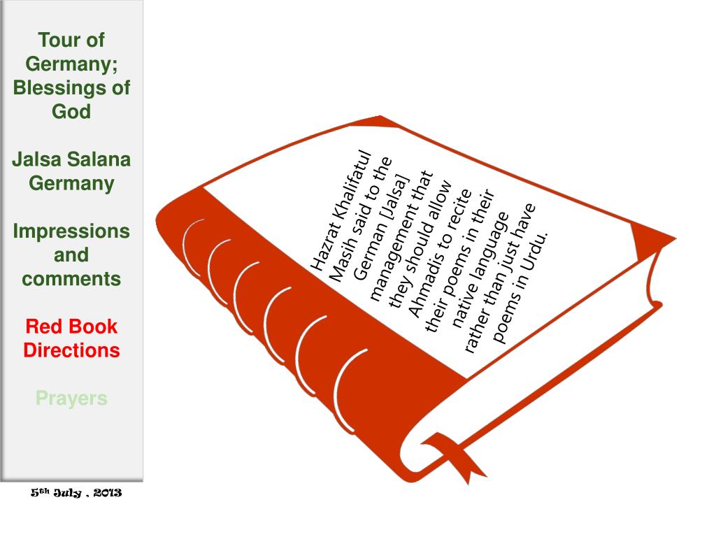Tour of Germany; Blessings of God Jalsa Salana Germany Impressions and comments Red Book Directions Prayers Hazrat Khalifatul Masih said to the German [Jalsa] management that they should allow Ahmadis to recite their poems in their native language rather than just have poems in Urdu. 5th July , 2013