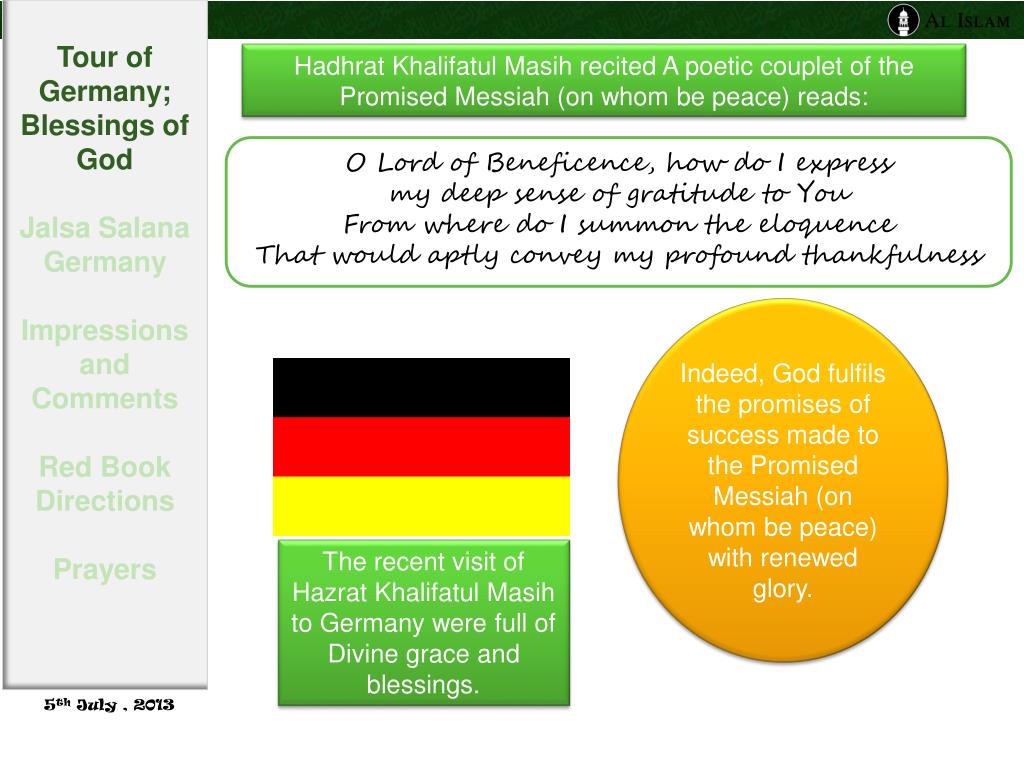 Tour of Germany; Blessings of God Jalsa Salana Germany Impressions and Comments Red Book Directions Prayers Hadhrat Khalifatul Masih recited A poetic couplet of the Promised Messiah (on whom be peace) reads: O Lord of Beneficence, how do I express my deep sense of gratitude to You From where do I summon the eloquence That would aptly convey my profound thankfulness Indeed, God fulfils the promises of success made to the Promised Messiah (on whom be peace) with renewed glory. The recent visit of HazratKhalifatul Masih to Germany were full of Divine grace and blessings. 5th July , 2013