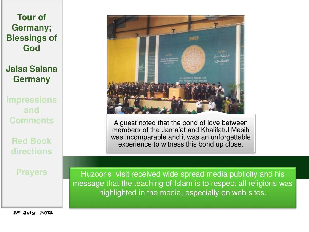 Tour of Germany; Blessings of God Jalsa Salana Germany Impressions and Comments Red Book directions Prayers Huzoor’s visit received wide spread media publicity and his message that the teaching of Islam is to respect all religions was highlighted in the media, especially on web sites. 5th July , 2013