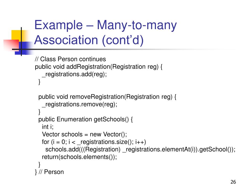 Example – Many-to-many Association (cont’d) class Person { private String _name; private Vector _registrations; public Person(String name) { _name = name; _registrations = new Vector(); } String getName() { return(_name); } void setName(String name) { _name = name; }