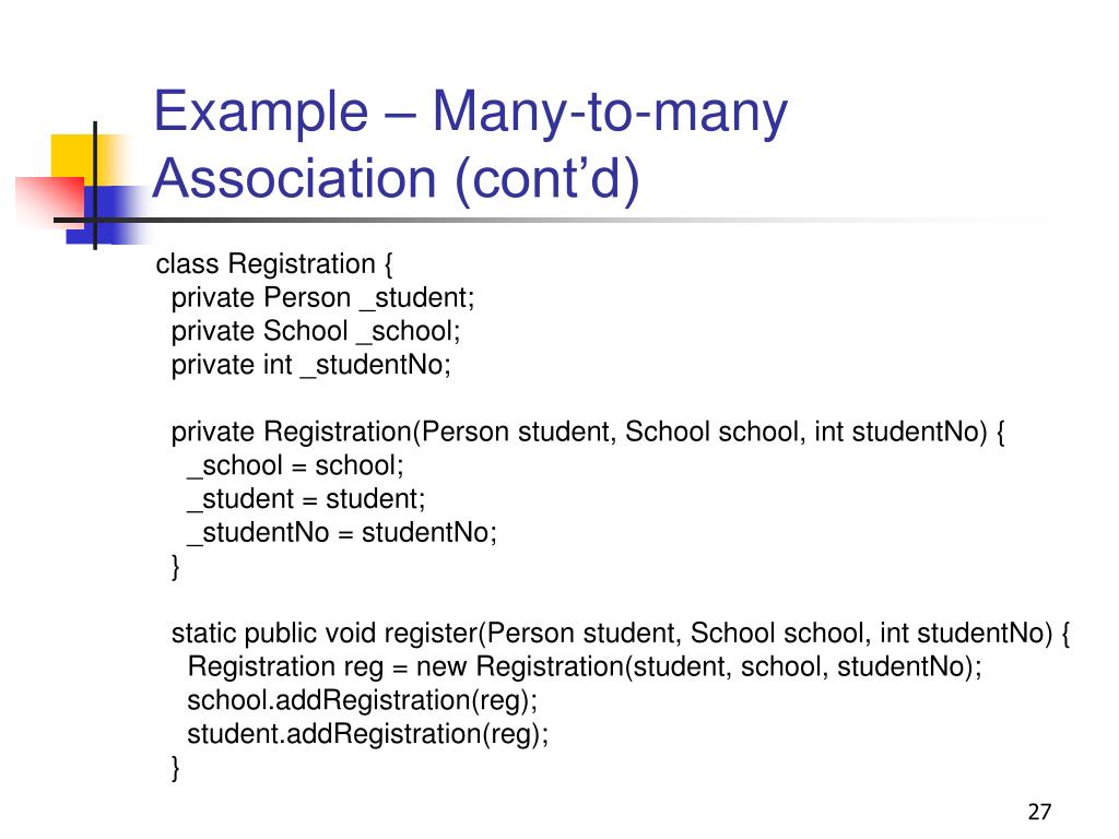 Example – Many-to-many Association (cont’d) // Class Registration continues public void deregister() { this._school.removeRegistration(this); this._student.removeRegistration(this); } public School getSchool() { return(_school); } public Person getStudent() { return(_student); } } // class Registration