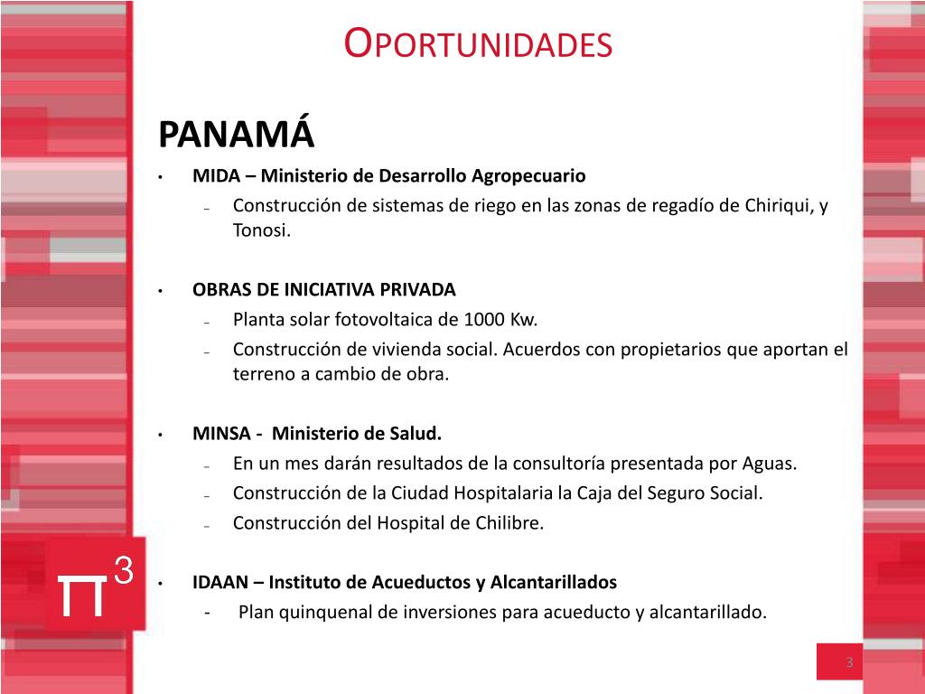 Oportunidades • PANAMÁ • MIDA – Ministerio de Desarrollo Agropecuario • Construcción de sistemas de riego en las zonas de regadío de Chiriqui, y Tonosi. • OBRAS DE INICIATIVA PRIVADA • Planta solar fotovoltaica de 1000 Kw. • Construcción de vivienda social. Acuerdos con propietarios que aportan el terreno a cambio de obra. • MINSA - Ministerio de Salud. • En un mes darán resultados de la consultoría presentada por Aguas. • Construcción de la Ciudad Hospitalaria la Caja del Seguro Social. • Construcción del Hospital de Chilibre. • IDAAN – Instituto de Acueductos y Alcantarillados - Plan quinquenal de inversiones para acueducto y alcantarillado.