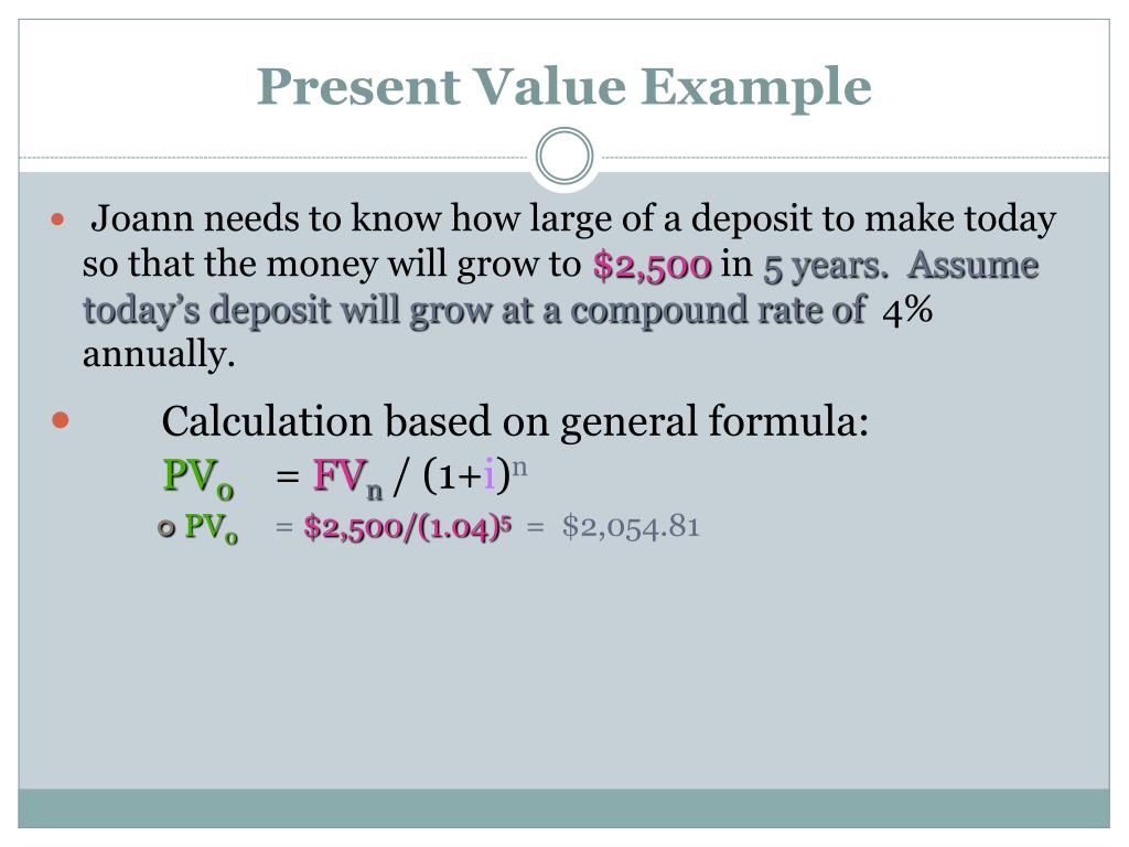 Present Value Example • Joann needs to know how large of a deposit to make today so that the money will grow to $2,500in 5 years. Assume today’s deposit will grow at a compound rate of 4% annually. • Calculation based on general formula: PV0 = FVn / (1+i)n • PV0= $2,500/(1.04)5= $2,054.81