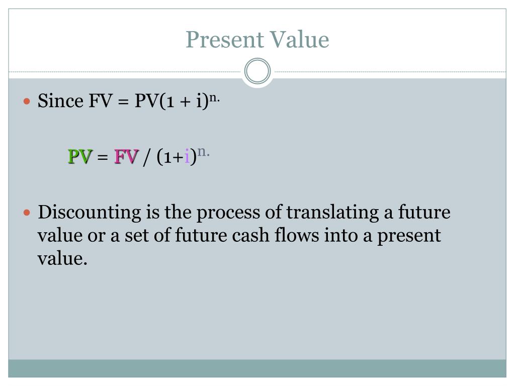 Present Value Since FV = PV(1 + i)n. PV= FV / (1+i)n. Discounting is the process of translating a future value or a set of future cash flows into a present value.