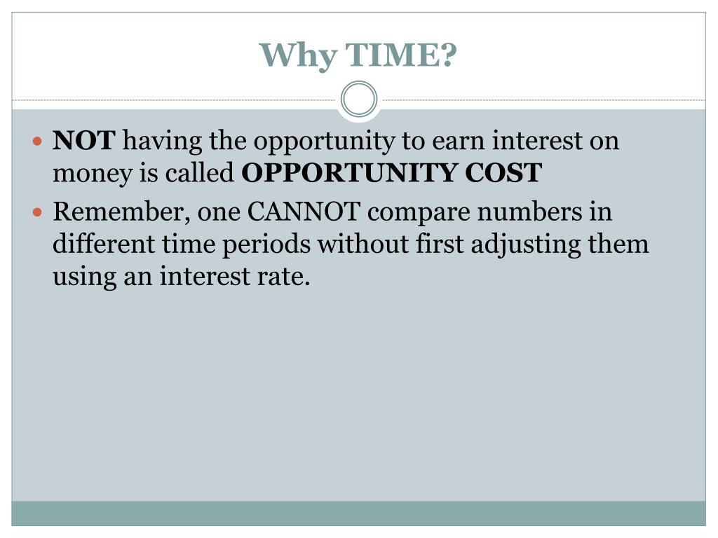 Why TIME? NOT having the opportunity to earn interest on money is called OPPORTUNITY COST Remember, one CANNOT compare numbers in different time periods without first adjusting them using an interest rate.