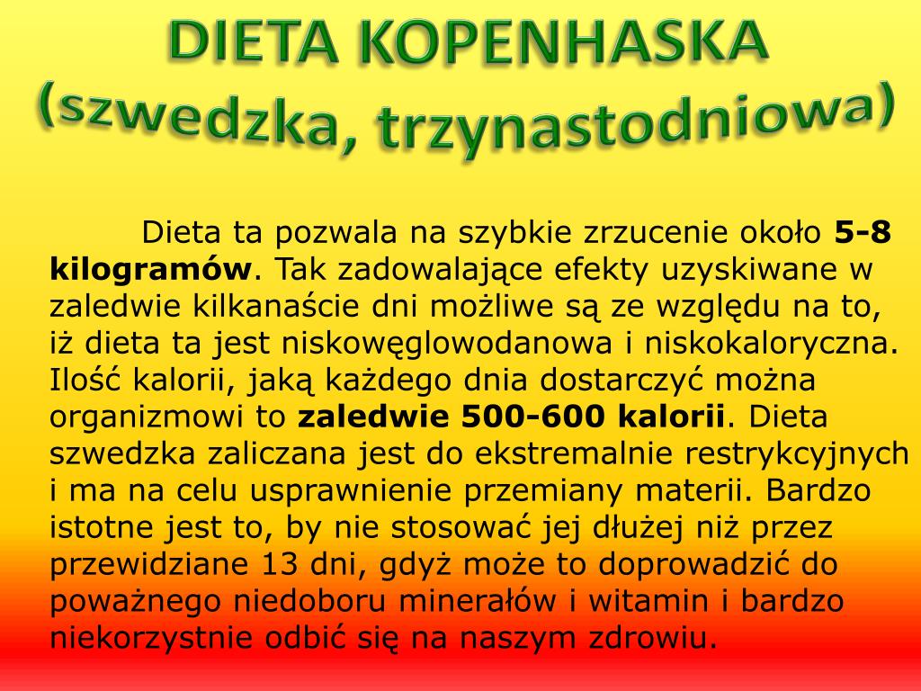 DIETA KOPENHASKA(szwedzka, trzynastodniowa) Dieta ta pozwala na szybkie zrzucenie około 5-8 kilogramów. Tak zadowalające efekty uzyskiwane w zaledwie kilkanaście dni możliwe są ze względu na to, iż dieta ta jest niskowęglowodanowa i niskokaloryczna. Ilość kalorii, jaką każdego dnia dostarczyć można organizmowi to zaledwie 500-600 kalorii. Dieta szwedzka zaliczana jest do ekstremalnie restrykcyjnych i ma na celu usprawnienie przemiany materii. Bardzo istotne jest to, by nie stosować jej dłużej niż przez przewidziane 13 dni, gdyż może to doprowadzić do poważnego niedoboru minerałów i witamin i bardzo niekorzystnie odbić się na naszym zdrowiu.
