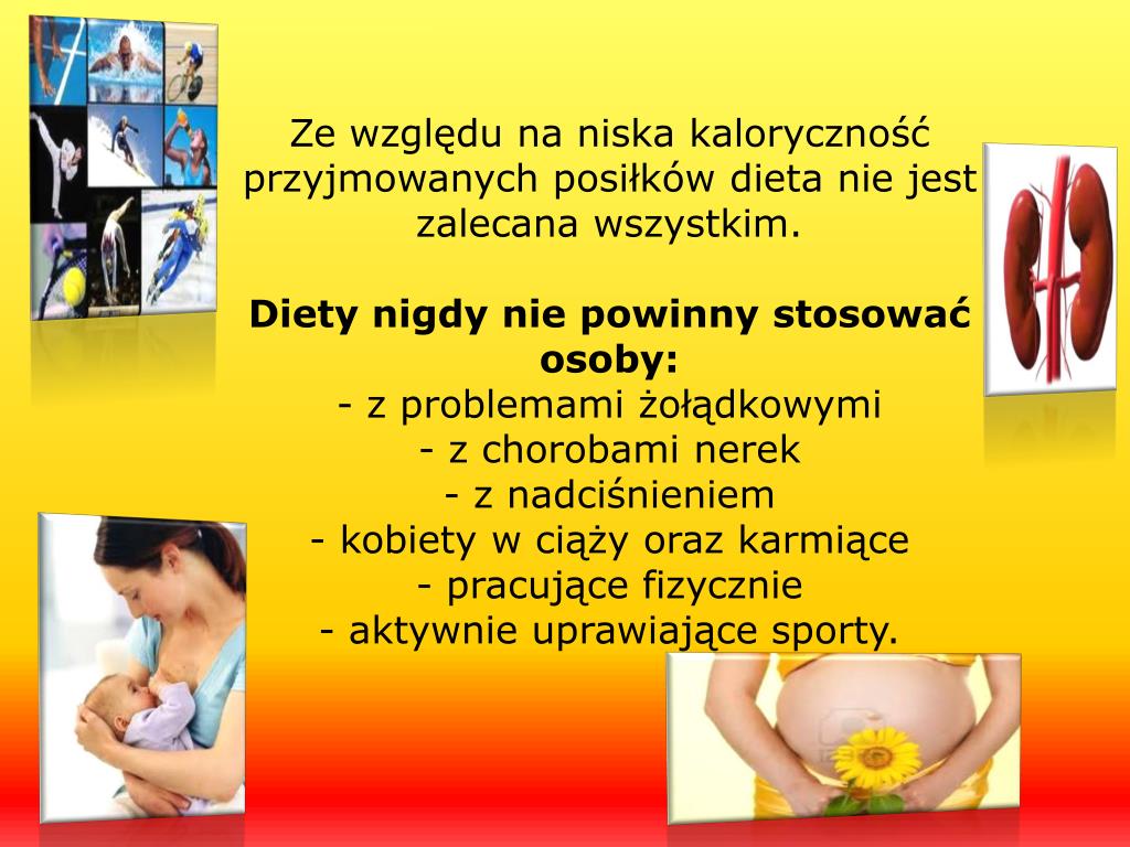 Ze względu na niska kaloryczność przyjmowanych posiłków dieta nie jest zalecana wszystkim.Diety nigdy nie powinny stosować osoby:- z problemami żołądkowymi- z chorobami nerek - z nadciśnieniem- kobiety w ciąży oraz karmiące- pracujące fizycznie - aktywnie uprawiające sporty.