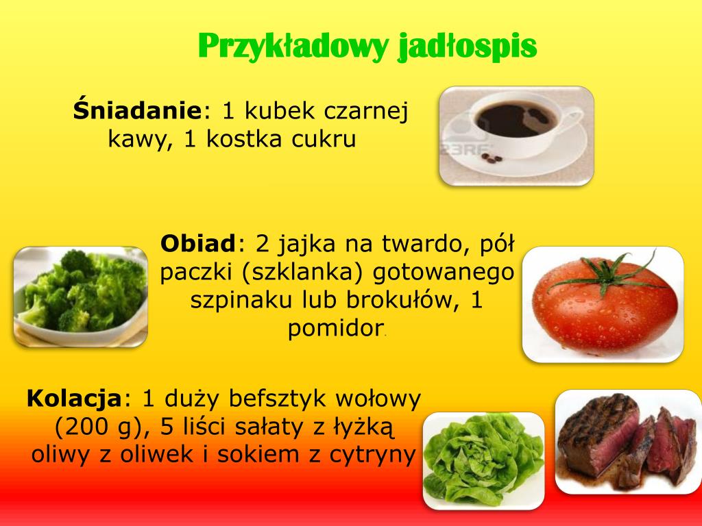 Przykładowy jadłospis Śniadanie: 1 kubek czarnej kawy, 1 kostka cukru Obiad: 2 jajka na twardo, pół paczki (szklanka) gotowanego szpinaku lub brokułów, 1 pomidor. Kolacja: 1 duży befsztyk wołowy (200 g), 5 liści sałaty z łyżką oliwy z oliwek i sokiem z cytryny