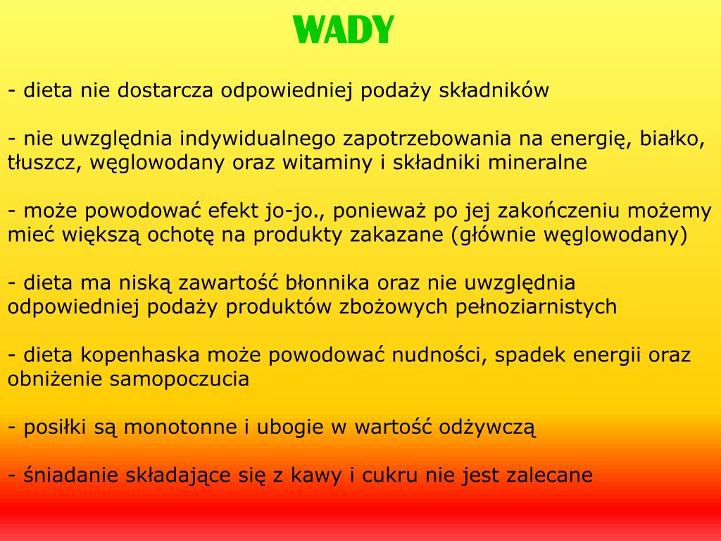 WADY - dieta nie dostarcza odpowiedniej podaży składników - nie uwzględnia indywidualnego zapotrzebowania na energię, białko, tłuszcz, węglowodany oraz witaminy i składniki mineralne- może powodować efekt jo-jo., ponieważ po jej zakończeniu możemy mieć większą ochotę na produkty zakazane (głównie węglowodany)- dieta ma niską zawartość błonnika oraz nie uwzględnia odpowiedniej podaży produktów zbożowych pełnoziarnistych- dieta kopenhaska może powodować nudności, spadek energii oraz obniżenie samopoczucia- posiłki są monotonne i ubogie w wartość odżywczą- śniadanie składające się z kawy i cukru nie jest zalecane