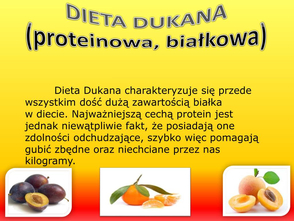DIETA DUKANA(proteinowa, białkowa) Dieta Dukana charakteryzuje się przede wszystkim dość dużą zawartością białkaw diecie. Najważniejszą cechą protein jest jednak niewątpliwie fakt, że posiadają one zdolności odchudzające, szybko więc pomagają gubić zbędne oraz niechciane przez nas kilogramy.