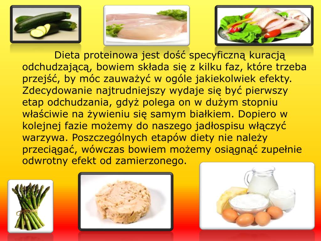 Dieta proteinowa jest dość specyficzną kuracją odchudzającą, bowiem składa się z kilku faz, które trzeba przejść, by móc zauważyć w ogóle jakiekolwiek efekty. Zdecydowanie najtrudniejszy wydaje się być pierwszy etap odchudzania, gdyż polega on w dużym stopniu właściwie na żywieniu się samym białkiem. Dopiero w kolejnej fazie możemy do naszego jadłospisu włączyć warzywa. Poszczególnych etapów diety nie należy przeciągać, wówczas bowiem możemy osiągnąć zupełnie odwrotny efekt od zamierzonego.