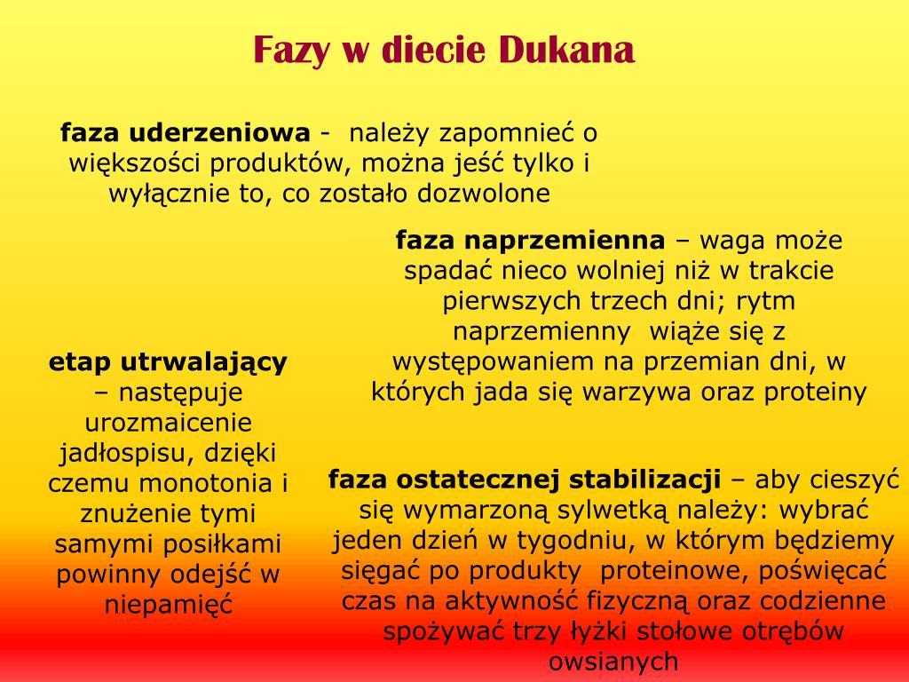 Fazy w diecie Dukana faza uderzeniowa - należy zapomnieć o większości produktów, można jeść tylko i wyłącznie to, co zostało dozwolone faza naprzemienna – waga może spadać nieco wolniej niż w trakcie pierwszych trzech dni; rytm naprzemienny wiąże się z występowaniem na przemian dni, w których jada się warzywa oraz proteiny etap utrwalający – następuje urozmaicenie jadłospisu, dzięki czemu monotonia i znużenie tymi samymi posiłkami powinny odejść w niepamięć faza ostatecznej stabilizacji – aby cieszyć się wymarzoną sylwetką należy: wybrać jeden dzień w tygodniu, w którym będziemy sięgać po produkty proteinowe, poświęcać czas na aktywność fizyczną oraz codzienne spożywać trzy łyżki stołowe otrębów owsianych