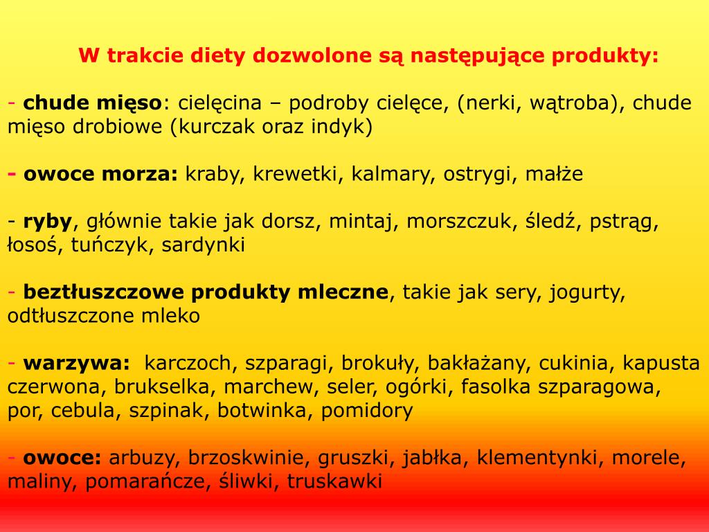 W trakcie diety dozwolone są następujące produkty: -chude mięso: cielęcina – podroby cielęce, (nerki, wątroba), chude mięso drobiowe (kurczak oraz indyk) -owoce morza: kraby, krewetki, kalmary, ostrygi, małże - ryby, głównie takie jak dorsz, mintaj, morszczuk, śledź, pstrąg, łosoś, tuńczyk, sardynki -beztłuszczowe produkty mleczne, takie jak sery, jogurty, odtłuszczone mleko -warzywa: karczoch, szparagi, brokuły, bakłażany, cukinia, kapusta czerwona, brukselka, marchew, seler, ogórki, fasolka szparagowa, por, cebula, szpinak, botwinka, pomidory -owoce: arbuzy, brzoskwinie, gruszki, jabłka, klementynki, morele, maliny, pomarańcze, śliwki, truskawki