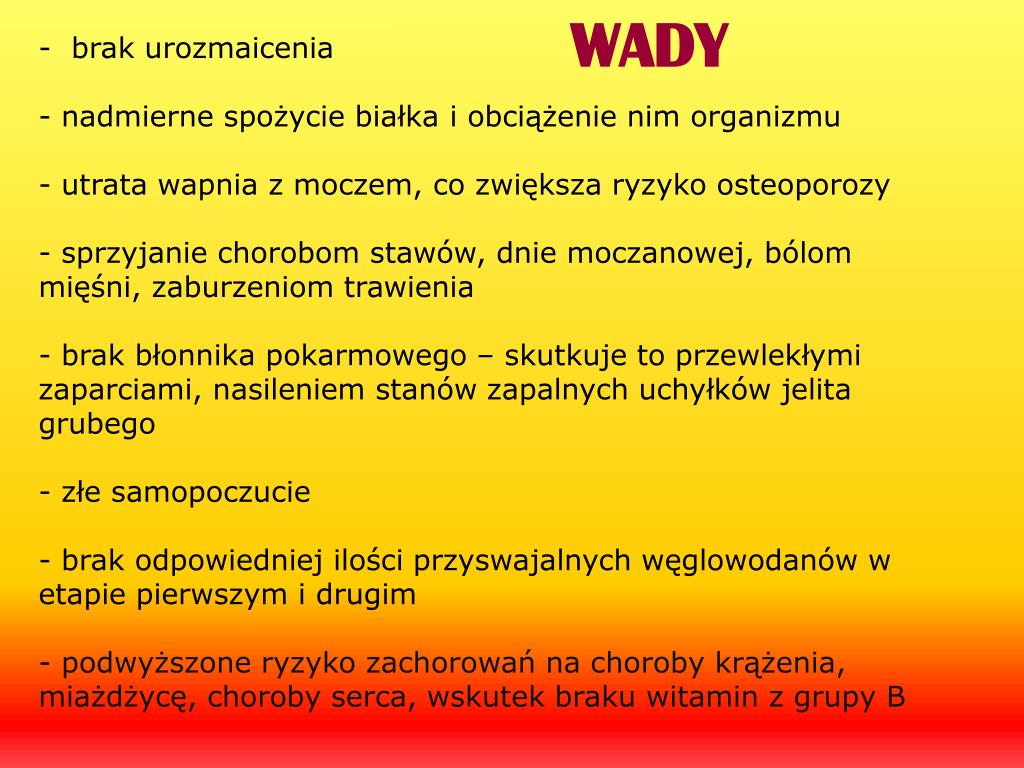WADY • - brak urozmaicenia- nadmierne spożycie białka i obciążenie nim organizmu- utrata wapnia z moczem, co zwiększa ryzyko osteoporozy- sprzyjanie chorobom stawów, dnie moczanowej, bólom mięśni, zaburzeniom trawienia- brak błonnika pokarmowego – skutkuje to przewlekłymi zaparciami, nasileniem stanów zapalnych uchyłków jelita grubego- złe samopoczucie - brak odpowiedniej ilości przyswajalnych węglowodanów w etapie pierwszym i drugim- podwyższone ryzyko zachorowań na choroby krążenia, miażdżycę, choroby serca, wskutek braku witamin z grupy B