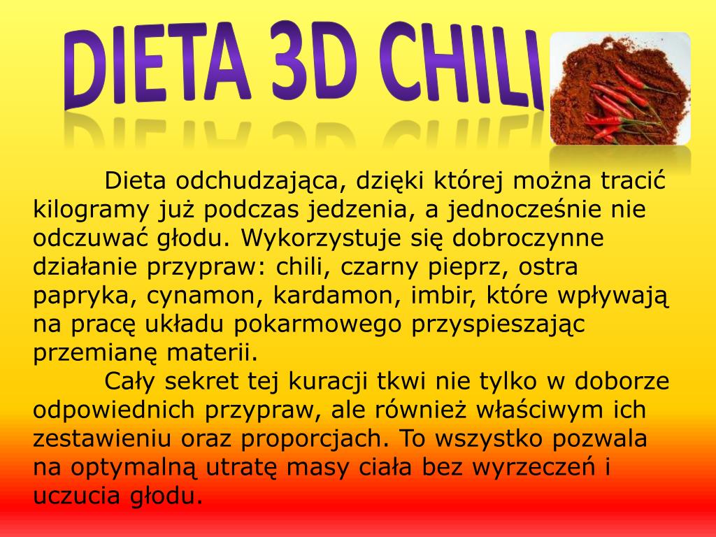Dieta 3d chili Dietaodchudzająca, dzięki której można tracić kilogramy już podczas jedzenia, a jednocześnie nie odczuwać głodu. Wykorzystuje się dobroczynne działanie przypraw: chili, czarny pieprz, ostra papryka, cynamon, kardamon, imbir, które wpływają na pracę układu pokarmowego przyspieszając przemianę materii. Cały sekret tej kuracji tkwi nie tylko w doborze odpowiednich przypraw, ale również właściwym ich zestawieniu oraz proporcjach. To wszystko pozwala na optymalną utratę masy ciała bez wyrzeczeń i uczucia głodu.