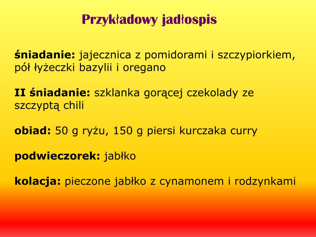 Przykładowy jadłospis śniadanie: jajecznica z pomidorami i szczypiorkiem, pół łyżeczki bazylii i oregano II śniadanie: szklanka gorącej czekolady ze szczyptą chili obiad: 50 g ryżu, 150 g piersi kurczaka curry podwieczorek: jabłko kolacja: pieczone jabłko z cynamonem i rodzynkami