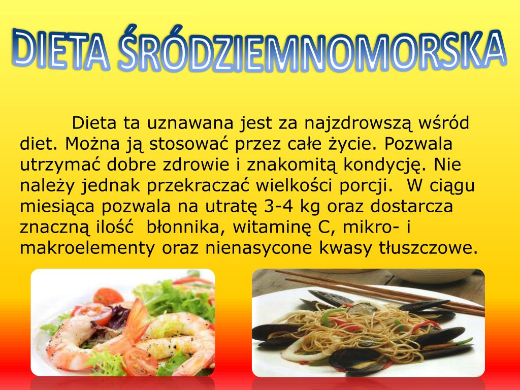 DIETA ŚRÓDZIEMNOMORSKA Dieta ta uznawana jest zanajzdrowszą wśród diet. Można ją stosować przez całe życie. Pozwala utrzymać dobre zdrowie i znakomitą kondycję. Nie należy jednak przekraczać wielkości porcji. W ciągu miesiąca pozwala na utratę 3-4 kg oraz dostarcza znaczną ilość błonnika, witaminę C, mikro- i makroelementy oraz nienasycone kwasy tłuszczowe.