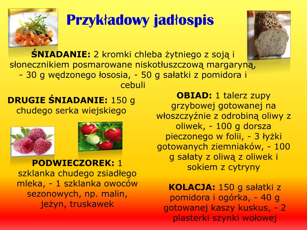 Przykładowy jadłospis ŚNIADANIE: 2 kromki chleba żytniego z soją i słonecznikiem posmarowane niskotłuszczową margaryną, - 30 g wędzonego łososia, - 50 g sałatki z pomidora i cebuli OBIAD: 1 talerz zupy grzybowej gotowanej na włoszczyźnie z odrobiną oliwy z oliwek, - 100 g dorsza pieczonego w folii, - 3 łyżki gotowanych ziemniaków, - 100 g sałaty z oliwą z oliwek i sokiem z cytryny DRUGIE ŚNIADANIE: 150 g chudego serka wiejskiego PODWIECZOREK: 1 szklanka chudego zsiadłego mleka, - 1 szklanka owoców sezonowych, np. malin, jeżyn, truskawek KOLACJA: 150 g sałatki z pomidora i ogórka, - 40 g gotowanej kaszy kuskus, - 2 plasterki szynki wołowej