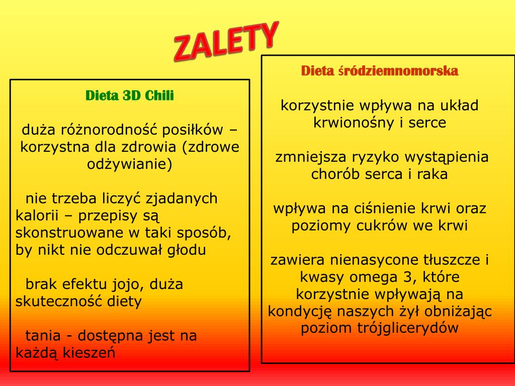 ZALETY Dieta śródziemnomorskakorzystnie wpływa na układ krwionośny i serce zmniejsza ryzyko wystąpienia chorób serca i rakawpływa na ciśnienie krwi oraz poziomy cukrów we krwizawiera nienasycone tłuszcze i kwasy omega 3, które korzystnie wpływają na kondycję naszych żył obniżając poziom trójglicerydów Dieta 3D Chiliduża różnorodność posiłków – korzystna dla zdrowia (zdrowe odżywianie) nie trzeba liczyć zjadanych kalorii – przepisy są skonstruowane w taki sposób, by nikt nie odczuwał głodu brak efektu jojo, duża skuteczność diety tania - dostępna jest na każdą kieszeń