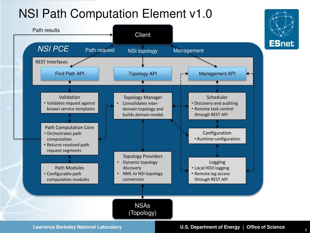 NSI Path Computation Element v1.0 Client Path results NSI PCE Path request Management NSI topology REST Interfaces Find Path API Management API Topology API • Validation • Validates request against known service templates • Scheduler • Discovery and auditing • Remote task control through REST API • Topology Manager • Consolidates inter-domain topology and builds domain model. • Path Computation Core • Orchestrates path computation • Returns resolved path request segments • Configuration • Runtime configuration • Topology Providers • Dynamic topology discovery • NML to NSI topology conversion • Logging • Local HDD logging. • Remote log access through REST API • Path Modules • Configurable path computation modules NSAs (Topology)