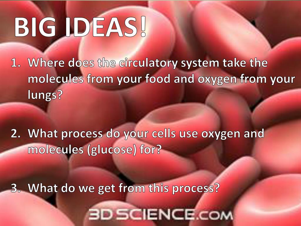 BIG IDEAS! • Where does the circulatory system take the molecules from your food and oxygen from your lungs? • What process do your cells use oxygen and molecules (glucose) for? • What do we get from this process?
