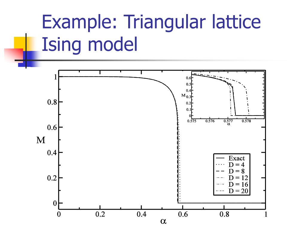 Example: Triangular lattice Ising model • Z = exp(K ij) • Realized by a tensor network with D=2: T111 = 1, T122 = T212 = T221 = , T112 = T121 = T211 = T222 = 0 where = e-2K.