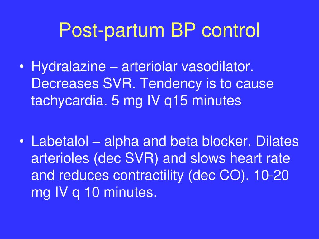 Post-partum BP control • Hydralazine – arteriolar vasodilator. Decreases SVR. Tendency is to cause tachycardia. 5 mg IV q15 minutes • Labetalol – alpha and beta blocker. Dilates arterioles (dec SVR) and slows heart rate and reduces contractility (dec CO). 10-20 mg IV q 10 minutes.