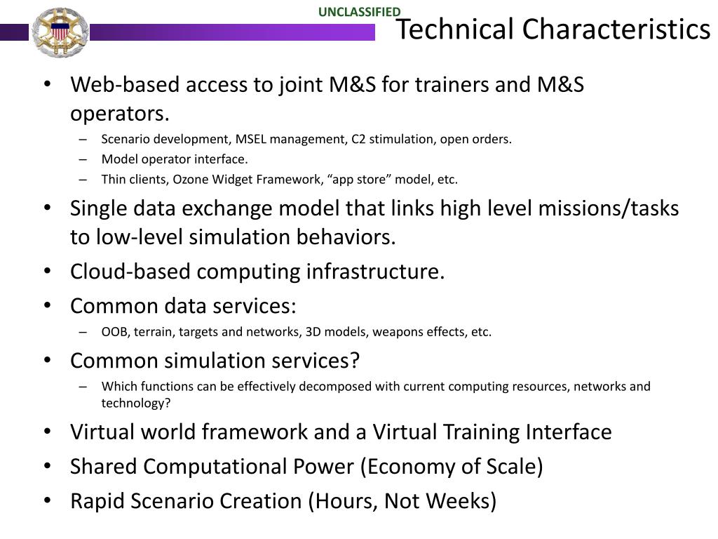 UNCLASSIFIED Technical Characteristics • Web-based access to joint M&S for trainers and M&S operators. • Scenario development, MSEL management, C2 stimulation, open orders. • Model operator interface. • Thin clients, Ozone Widget Framework, “app store” model, etc. • Single data exchange model that links high level missions/tasks to low-level simulation behaviors. • Cloud-based computing infrastructure. • Common data services: • OOB, terrain, targets and networks, 3D models, weapons effects, etc. • Common simulation services? • Which functions can be effectively decomposed with current computing resources, networks and technology? • Virtual world framework and a Virtual Training Interface • Shared Computational Power (Economy of Scale) • Rapid Scenario Creation (Hours, Not Weeks)