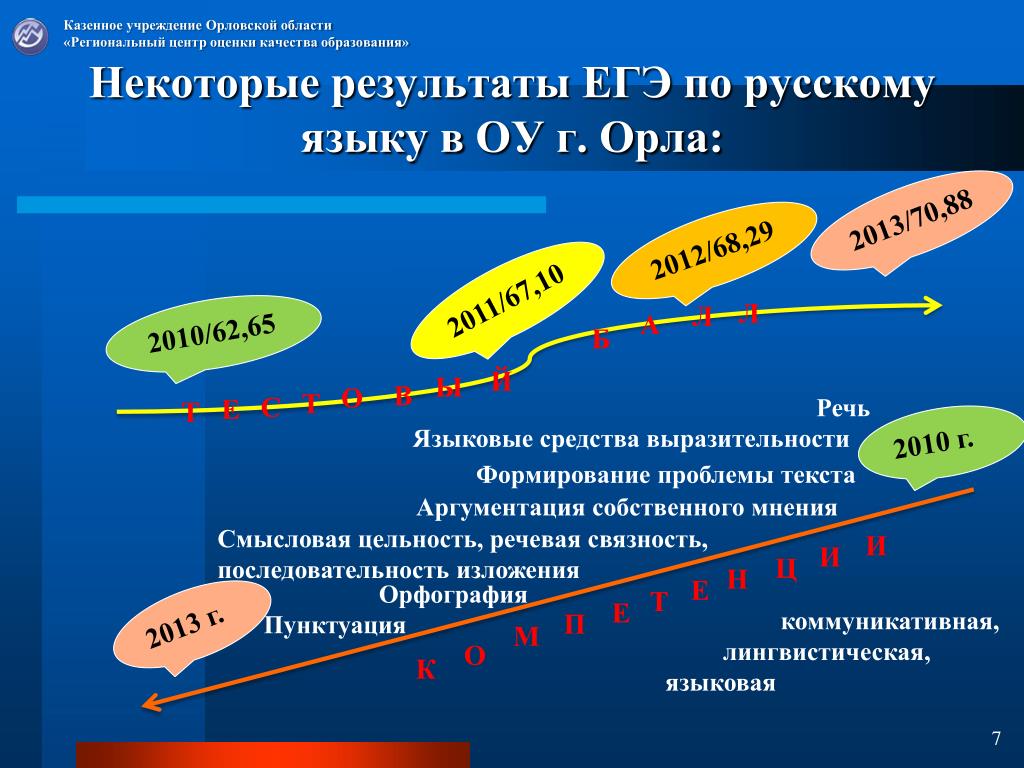 Казенное учреждение Орловской области «Региональный центр оценки качества образования» Некоторые результаты ЕГЭ по русскому языку в ОУ г. Орла: 2013/70,88 2012/68,29 2011/67,10 Л Л 2010/62,65 А Б Й Ы В О Т С Е Речь Языковые средства выразительности Т 2010 г. Формирование проблемы текста Аргументация собственного мнения Смысловая цельность, речевая связность, последовательность изложения И И Ц Н Е Орфография Пунктуация Т Е 2013 г. коммуникативная, лингвистическая, языковая П М О К