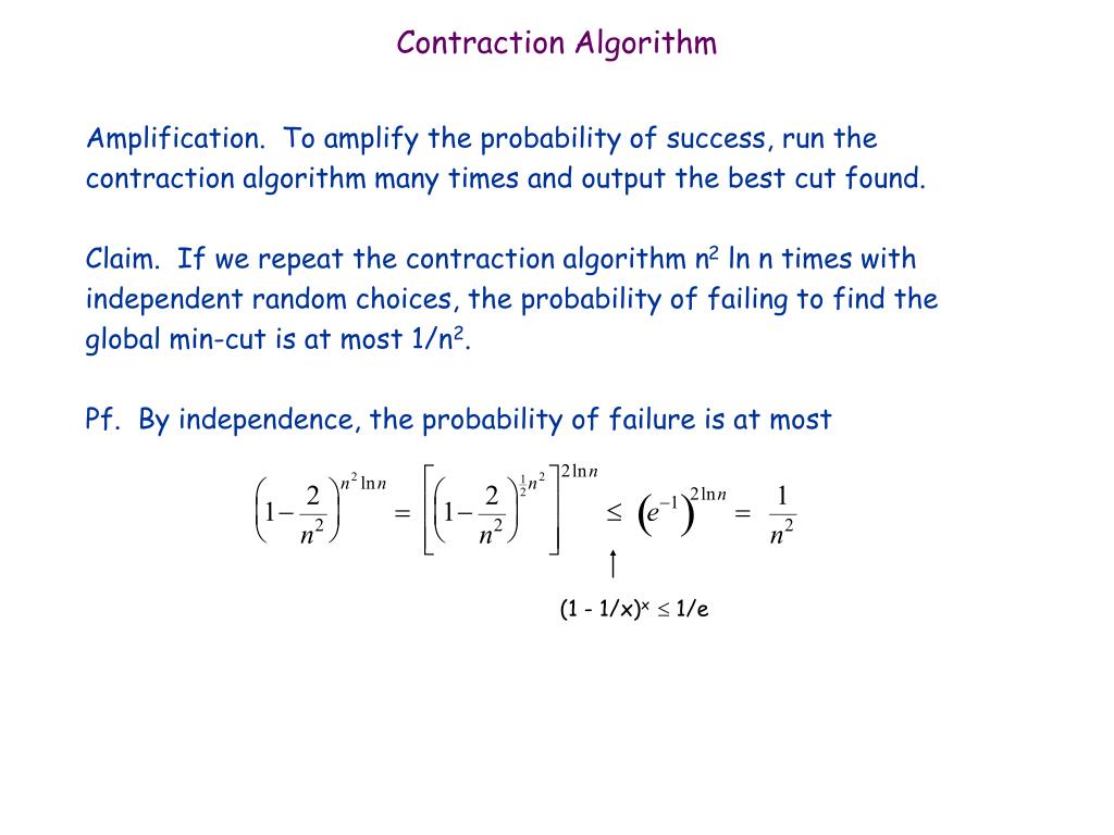 Contraction Algorithm • Amplification. To amplify the probability of success, run the contraction algorithm many times and output the best cut found. • Claim. If we repeat the contraction algorithm n2 ln n times with independent random choices, the probability of failing to find the global min-cut is at most 1/n2. • Pf. By independence, the probability of failure is at most (1 - 1/x)x 1/e