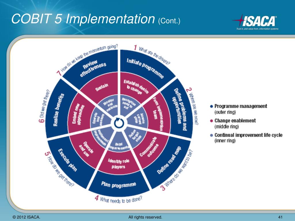 COBIT 5 Implementation (Cont.) • COBIT 5 Implementation covers the following subjects: • Positioning GEITwithin an enterprise • Taking the first steps towards improvingGEIT • Implementation challenges and success factors • EnablingGEIT-related organisational and behavioural change • Implementing continual improvement that includes change enablement and programme management • Using COBIT 5 and its components © 2012 ISACA. All rights reserved. 40