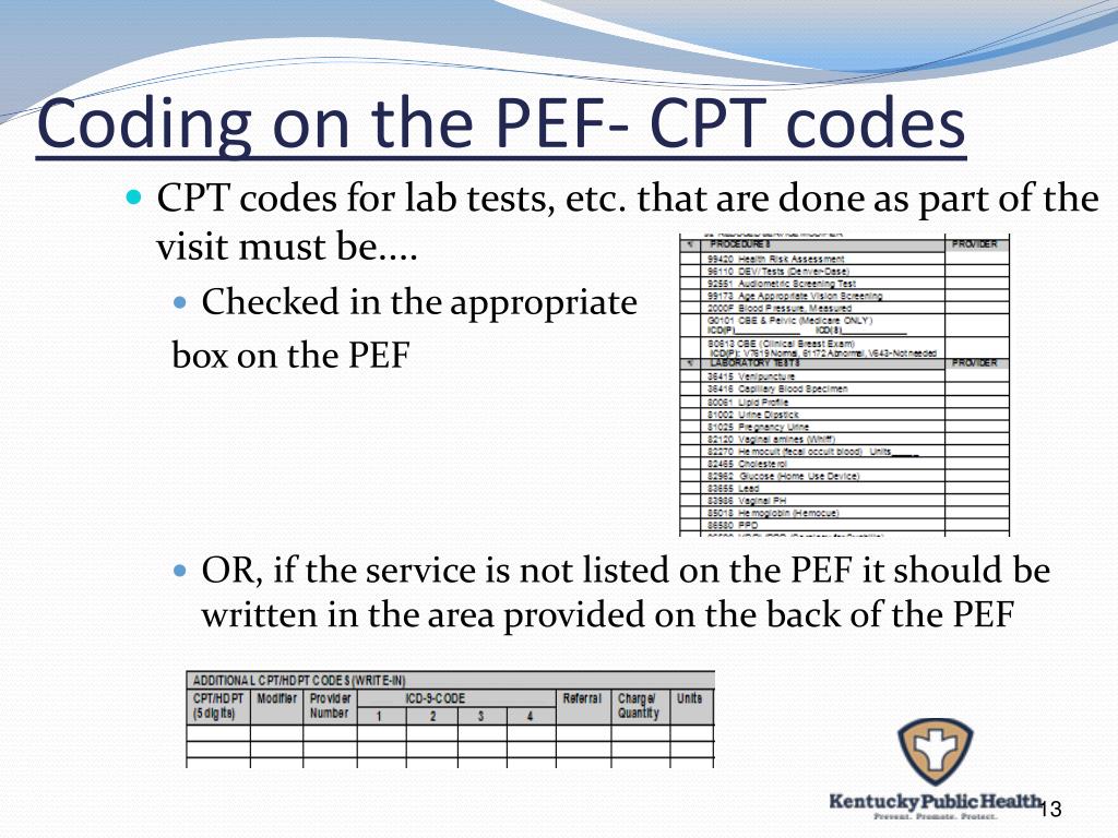 Coding on the PEF- CPT codes CPT codes for lab tests, etc. that are done as part of the visit must be.... Checked in the appropriate box on the PEF OR, if the service is not listed on the PEF it should be written in the area provided on the back of the PEF