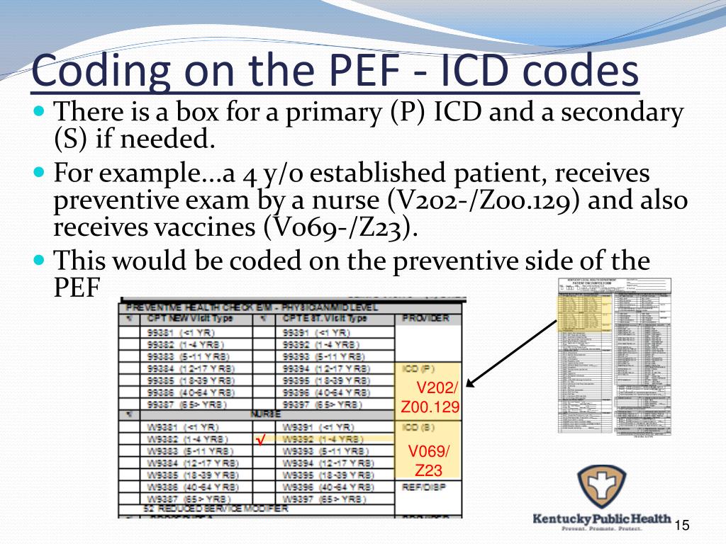 Coding on the PEF - ICD codes • There is a box for a primary (P) ICD and a secondary (S) if needed. • For example...a 4 y/o established patient, receives preventive exam by a nurse (V202-/Z00.129) and also receives vaccines (V069-/Z23). • This would be coded on the preventive side of the PEF V202/ Z00.129 √ V069/ Z23