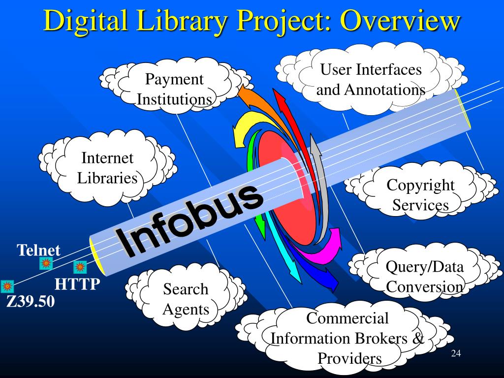 User Interfacesand Annotations Payment Institutions Internet Libraries Copyright Services Telnet Query/Data Conversion HTTP Search Agents Z39.50 Commercial Information Brokers & Providers Digital Library Project: Overview