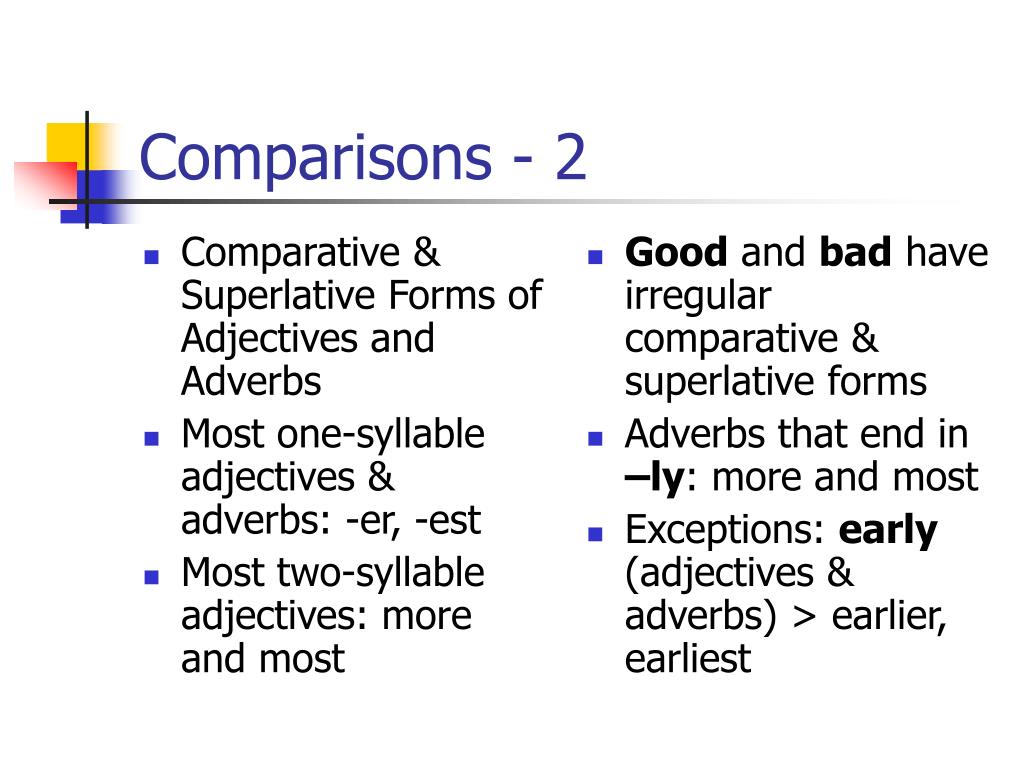Comparative & Superlative Forms of Adjectives and Adverbs Most one-syllable adjectives & adverbs: -er, -est Most two-syllable adjectives: more and most Good and bad have irregular comparative & superlative forms Adverbs that end in –ly: more and most Exceptions: early (adjectives & adverbs) > earlier, earliest Comparisons - 2