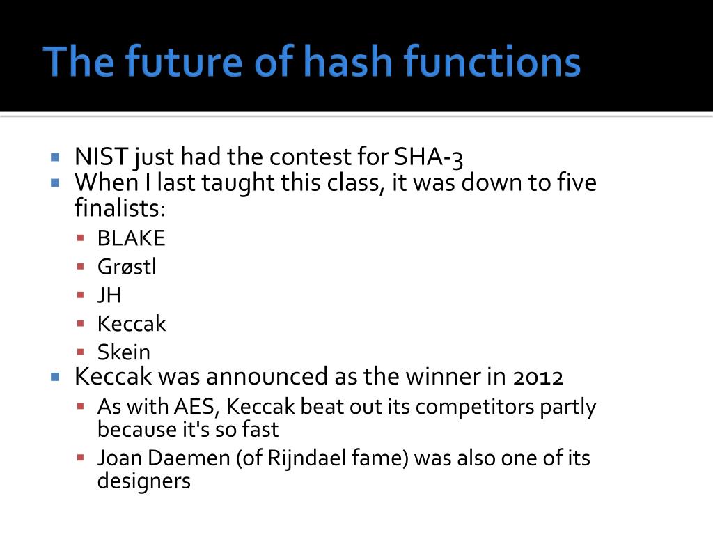 The future of hash functions • NIST just had the contest for SHA-3 • When I last taught this class, it was down to five finalists: • BLAKE • Grøstl • JH • Keccak • Skein • Keccak was announced as the winner in 2012 • As with AES, Keccak beat out its competitors partly because it's so fast • Joan Daemen (of Rijndael fame) was also one of its designers