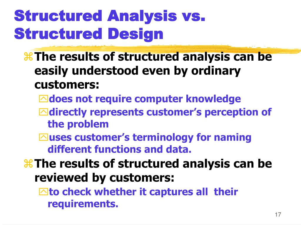 Structured Analysis vs. Structured Design • The results of structured analysis can be easily understood even by ordinary customers: • does not require computer knowledge • directly represents customer’s perception of the problem • uses customer’s terminology for naming different functions and data. • The results of structured analysis can be reviewed by customers: • to check whether it captures all their requirements.