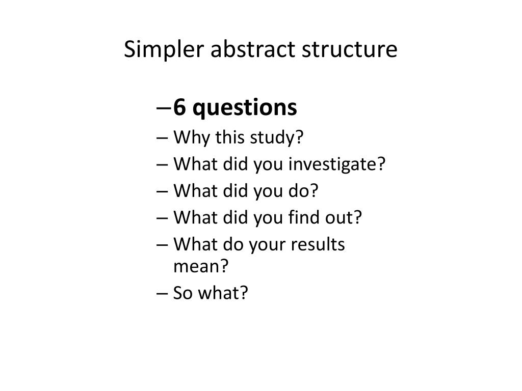 Simpler abstract structure • 6 questions • Why this study? • What did you investigate? • What did you do? • What did you find out? • What do your results mean? • So what?