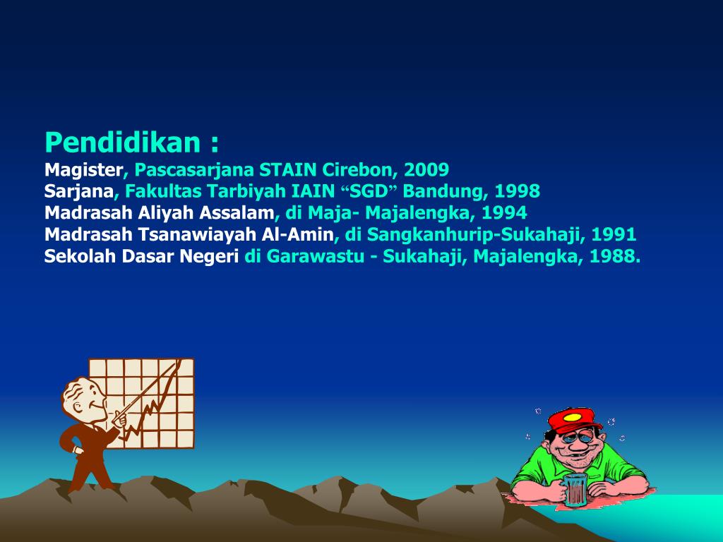Pendidikan : Magister, Pascasarjana STAIN Cirebon, 2009 Sarjana, Fakultas Tarbiyah IAIN “SGD” Bandung, 1998 Madrasah Aliyah Assalam, di Maja- Majalengka, 1994 Madrasah Tsanawiayah Al-Amin, di Sangkanhurip-Sukahaji, 1991 Sekolah Dasar Negeri di Garawastu - Sukahaji, Majalengka, 1988.