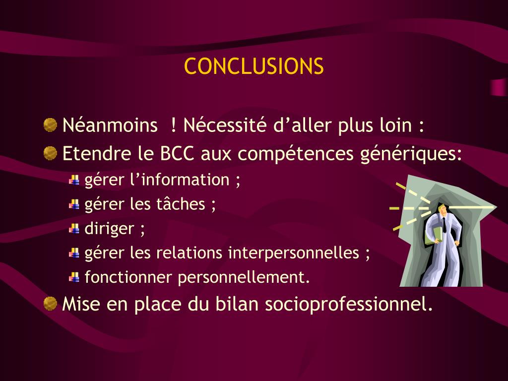 CONCLUSIONS • Néanmoins ! Nécessité d’aller plus loin : • Etendre le BCC aux compétences génériques: • gérer l’information ; • gérer les tâches ; • diriger ; • gérer les relations interpersonnelles ; • fonctionner personnellement. • Mise en place du bilan socioprofessionnel.