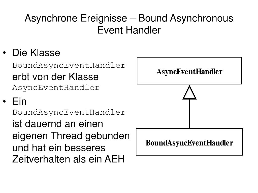 Asynchrone Ereignisse – Bound Asynchronous Event Handler • Die Klasse BoundAsyncEventHandler erbt von der Klasse AsyncEventHandler • Ein BoundAsyncEventHandler ist dauernd an einen eigenen Thread gebunden und hat ein besseres Zeitverhalten als ein AEH