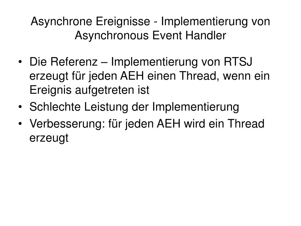 Asynchrone Ereignisse - Implementierung von Asynchronous Event Handler • Die Referenz – Implementierung von RTSJ erzeugt für jeden AEH einen Thread, wenn ein Ereignis aufgetreten ist • Schlechte Leistung der Implementierung • Verbesserung: für jeden AEH wird ein Thread erzeugt